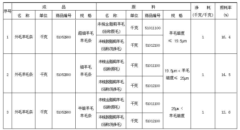 工藝損耗:指因加工生產(chǎn)工藝要求,在生產(chǎn)過程中必須耗用,且不能物化在外毛羊毛條中的原毛或洗凈毛的重量(千克)。