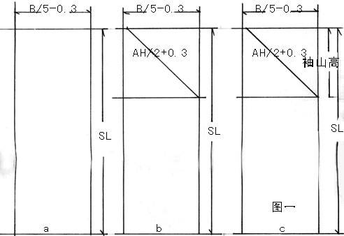 第一種:先確定袖肥,如袖肥B/5-0.3,再根據(jù)袖窿弧線的長度AH/2+0.3定袖山高度。(圖一a、b、c)制作出的西服袖子,袖的弧線一般比袖窿線長3.5cm左右,吃勢可根據(jù)面料的厚薄作相應(yīng)的調(diào)節(jié)(如AH/2±x,吃勢的量:薄型面料一般為1.5-2.5cm,普通型面料為2.5-3.5cm,厚型面料一般為3.5-5cm。