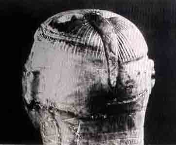 辮發局部(河南安陽股墟婦好墓出土的玉人)。商代男子發式,以梳辮發為主。從形象資料來看,這個時期的男子辮發樣式較多,有總發至頂,編成一個辮子,垂至腦后的;有左右兩側梳辮,辮梢卷曲,下垂至肩的;有將發編成辮子盤繞于頂的等等。本圖為總發至頂,編成一個辮子,垂至腦后的。