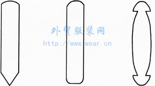 2.插片(竹) 這是一種較牢固、有彈性的條狀物。主要用于襯衫領處,作用是使領堅挺,防止領扭曲。其材料有滌綸塑膠、尼龍塑膠等。長度、寬度、形狀各不相同,常見的形狀如下圖。插片厚薄與布料和襯衫的款式等有關,如領尖小短的,則要用較小的插片(竹)。