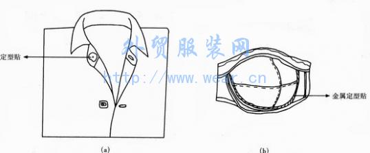 4.特殊定型里 在成衣某部位加一些特殊的定型里,如女胸圍、腰峰處的金屬定型里等,是利用定型里襯來保持服裝的某一形狀。圖(b)為金屬定型貼里。