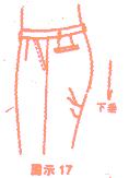 開襠過小,或挖度不到位,后襠部位即被前襠拉緊,引起抽吊(見圖示16)﹔ 開襠過大或挖度過大,后襠即會下垂,出現不正常的松馳(見圖示17)﹔ 后翹過高,坡度過大,會引起褲腰后部起空、不貼身(見圖示18)﹔ 后翹高,再加上臀部不到位,后襠上端產生水扭(見圖示19)﹔ 后翹偏低,不僅會引起后襠緊勢,同時也會牽連中縫起扭(見圖示20)。