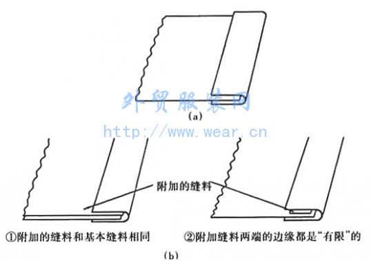 第五類縫型的附加縫料可以一端邊緣是"有限"的或兩端邊緣都是"有限"的,如圖(b)所示。