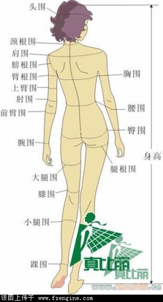頭圍、頸根圍,肩圍,膀根圍,臂根圍,上臂圍,肘圍,前臂圍,胸圍,腰圍,臀圍,腿根圍......比較全了,不一一列舉,請看圖